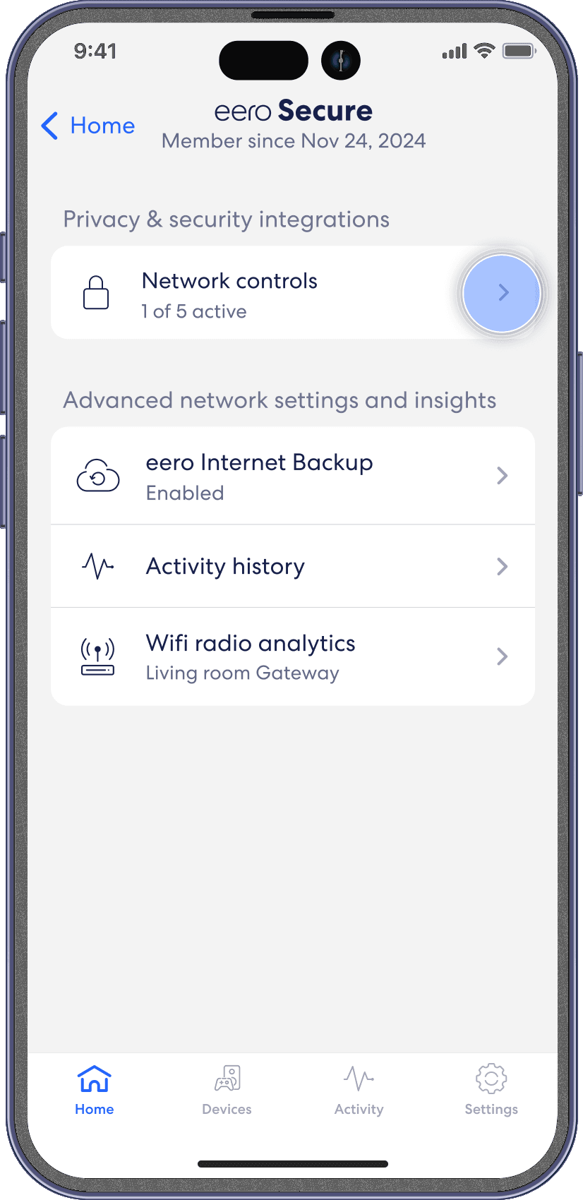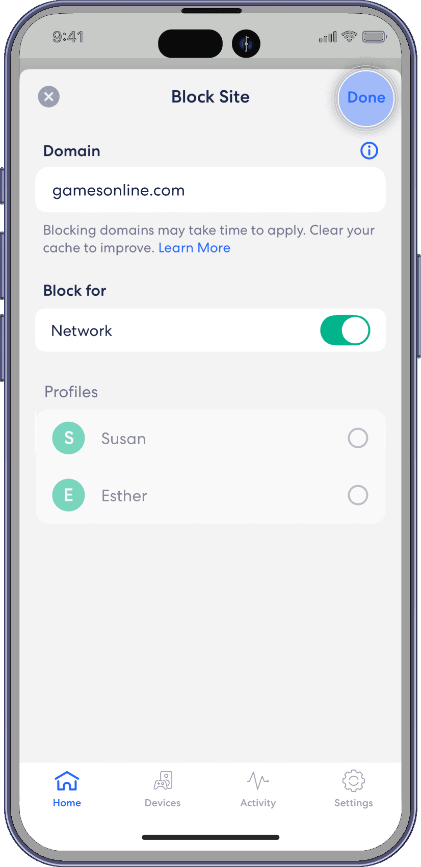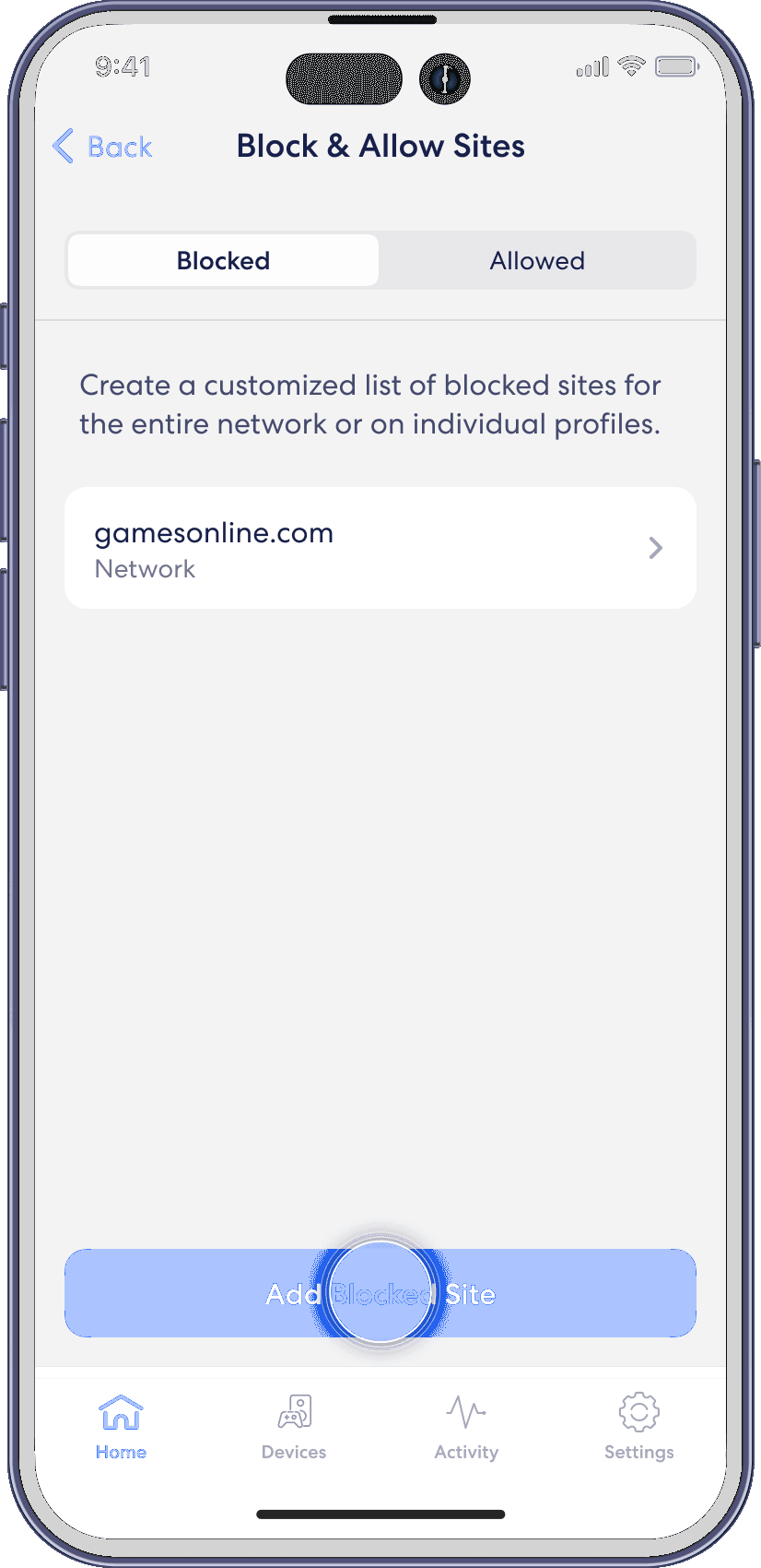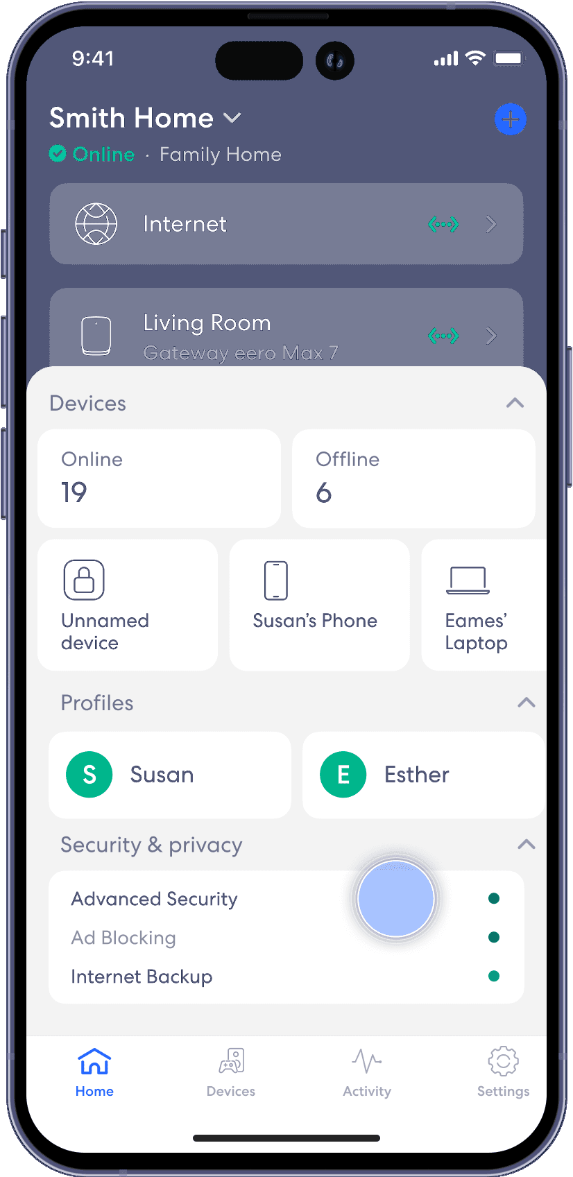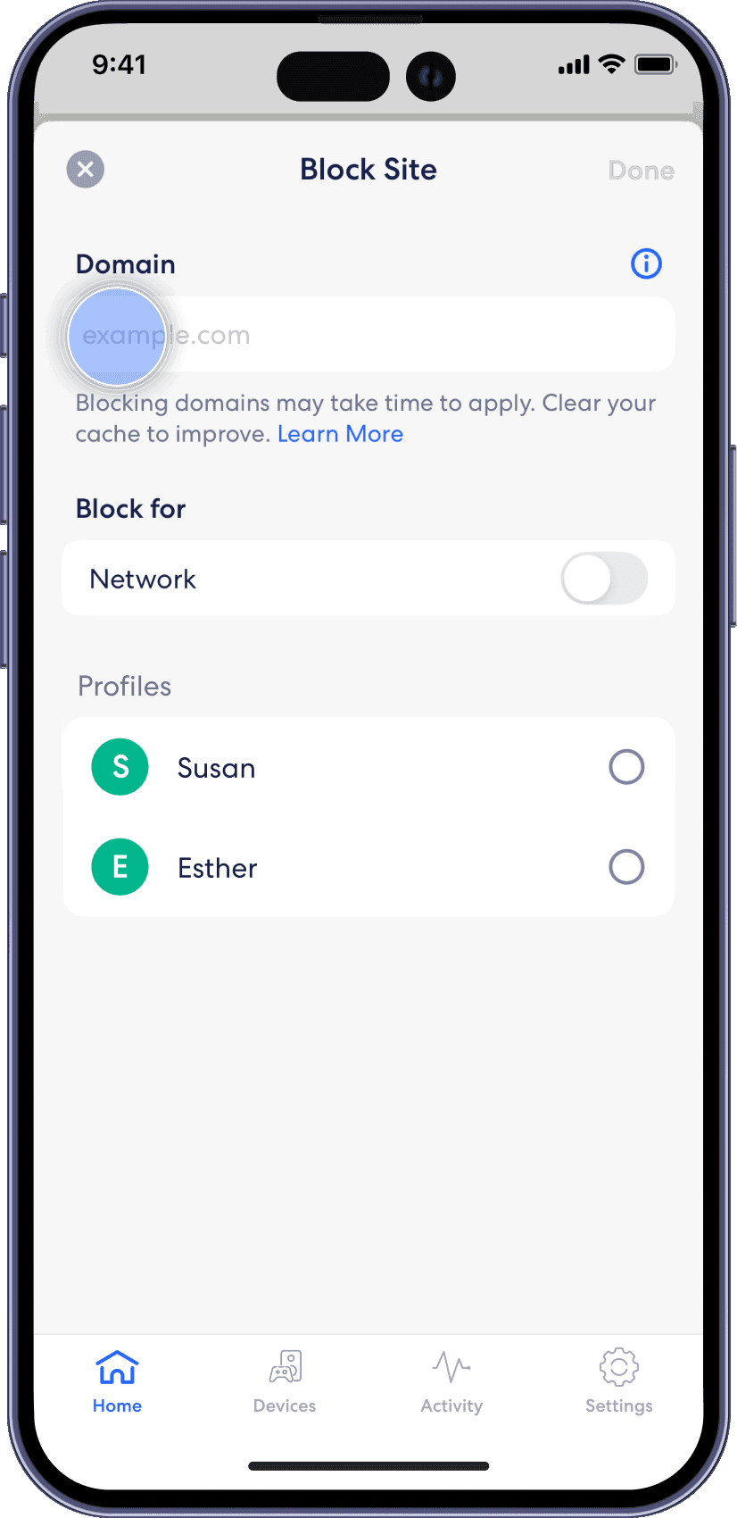 Help prevent particular websites from displaying on certain family members’ devices. Add a site to block from the home tab in the eero mobile app.
