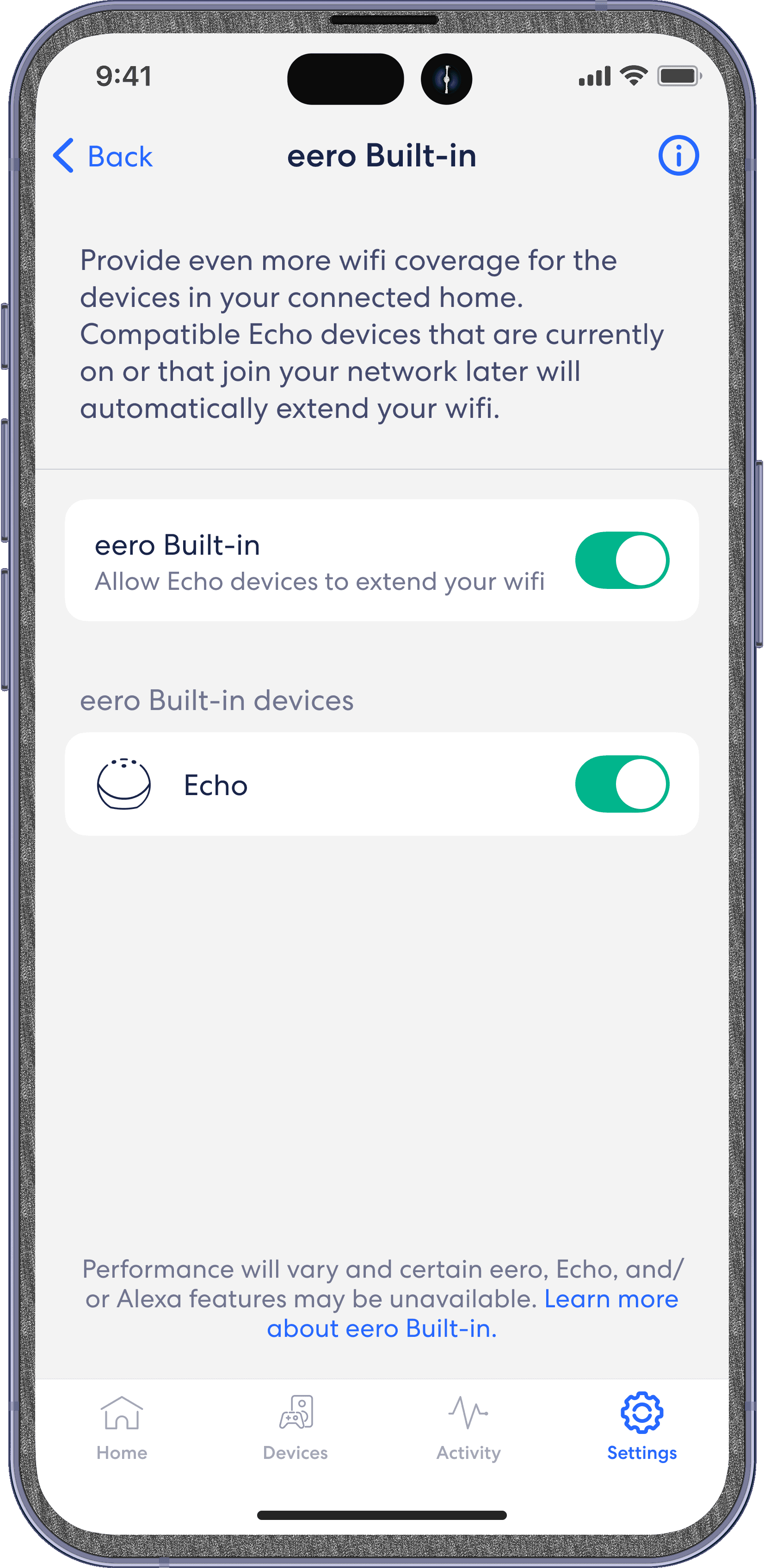 With eero Built-in and select Echo devices, you can add up to 1,000 sq. ft. of coverage to a compatible eero network.