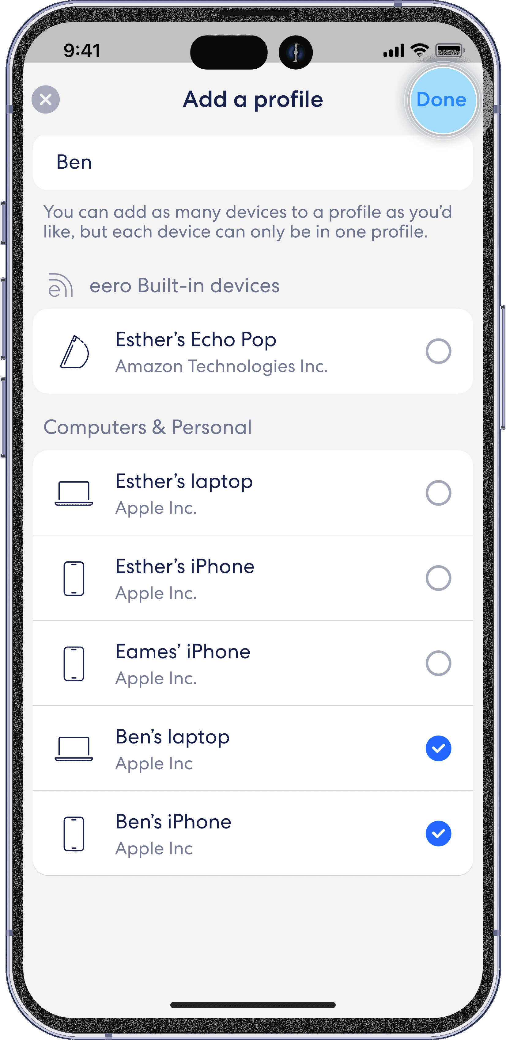 Add any devices that will be associated with the profile and then tap Done in the top right.