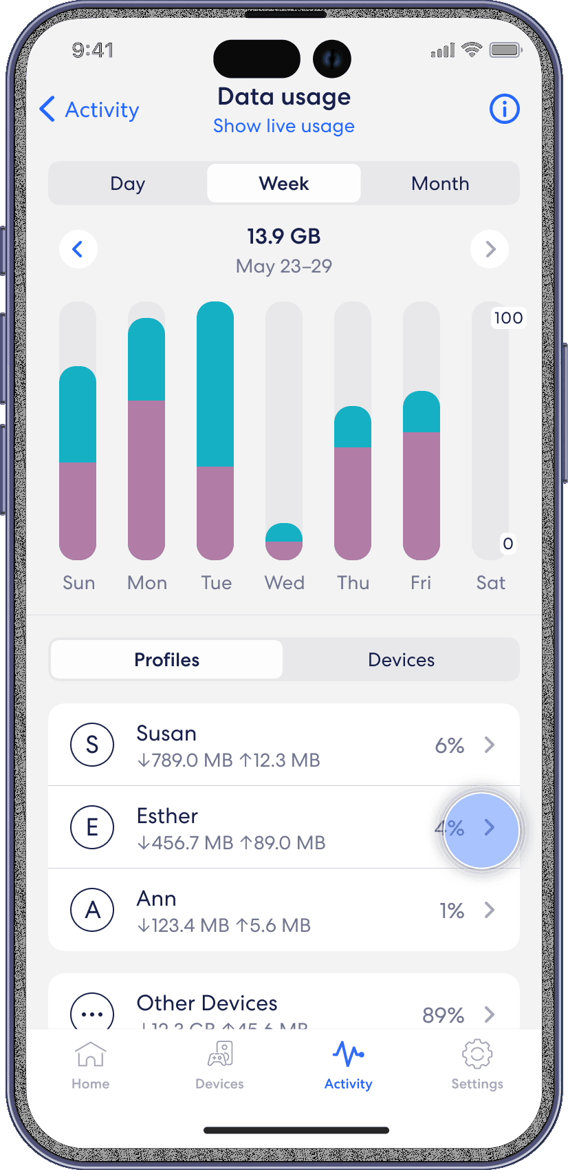 Navigate between Day, Week, and Month tabs, and the Profiles and Devices tabs