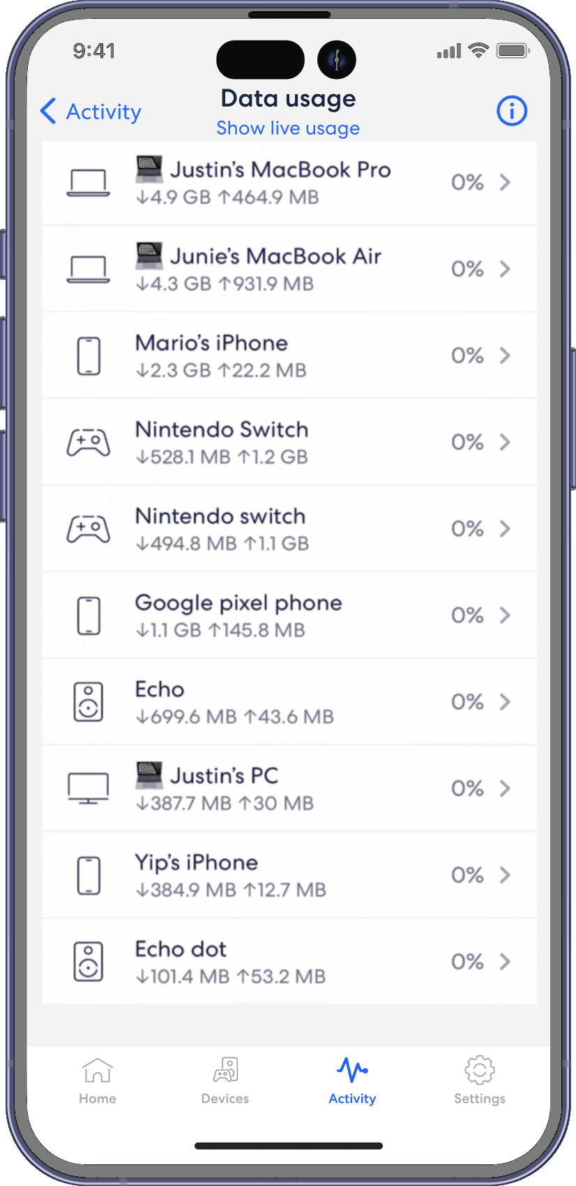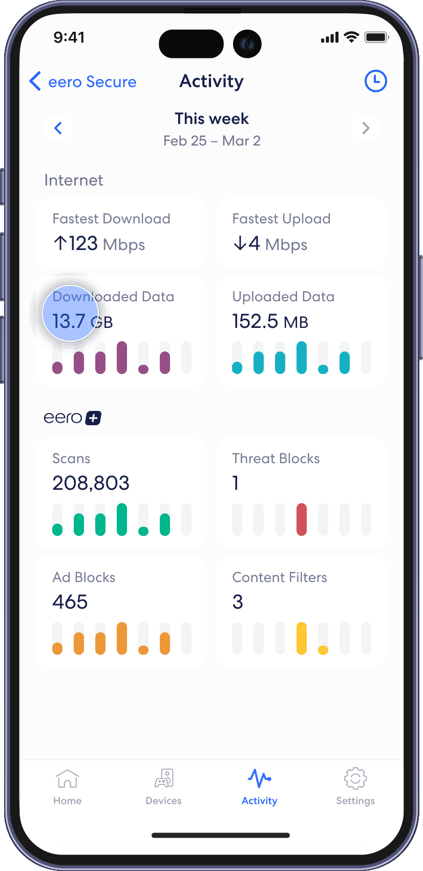 Check out the Activity tab to see how eero is handling threats, ads, and Content Filters based on your choices for your network. View data usage activity from the Activity tab in the eero mobile app.
