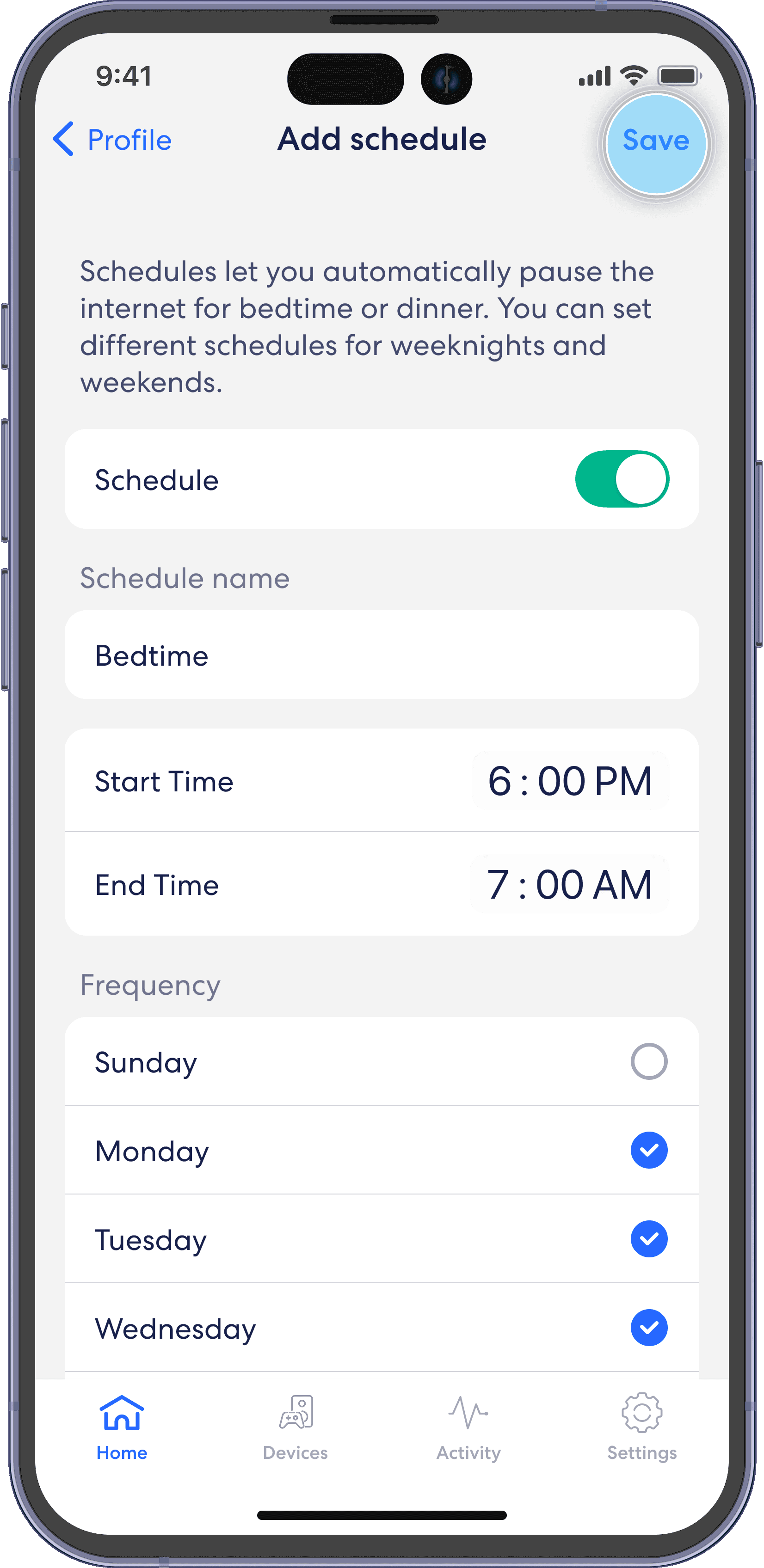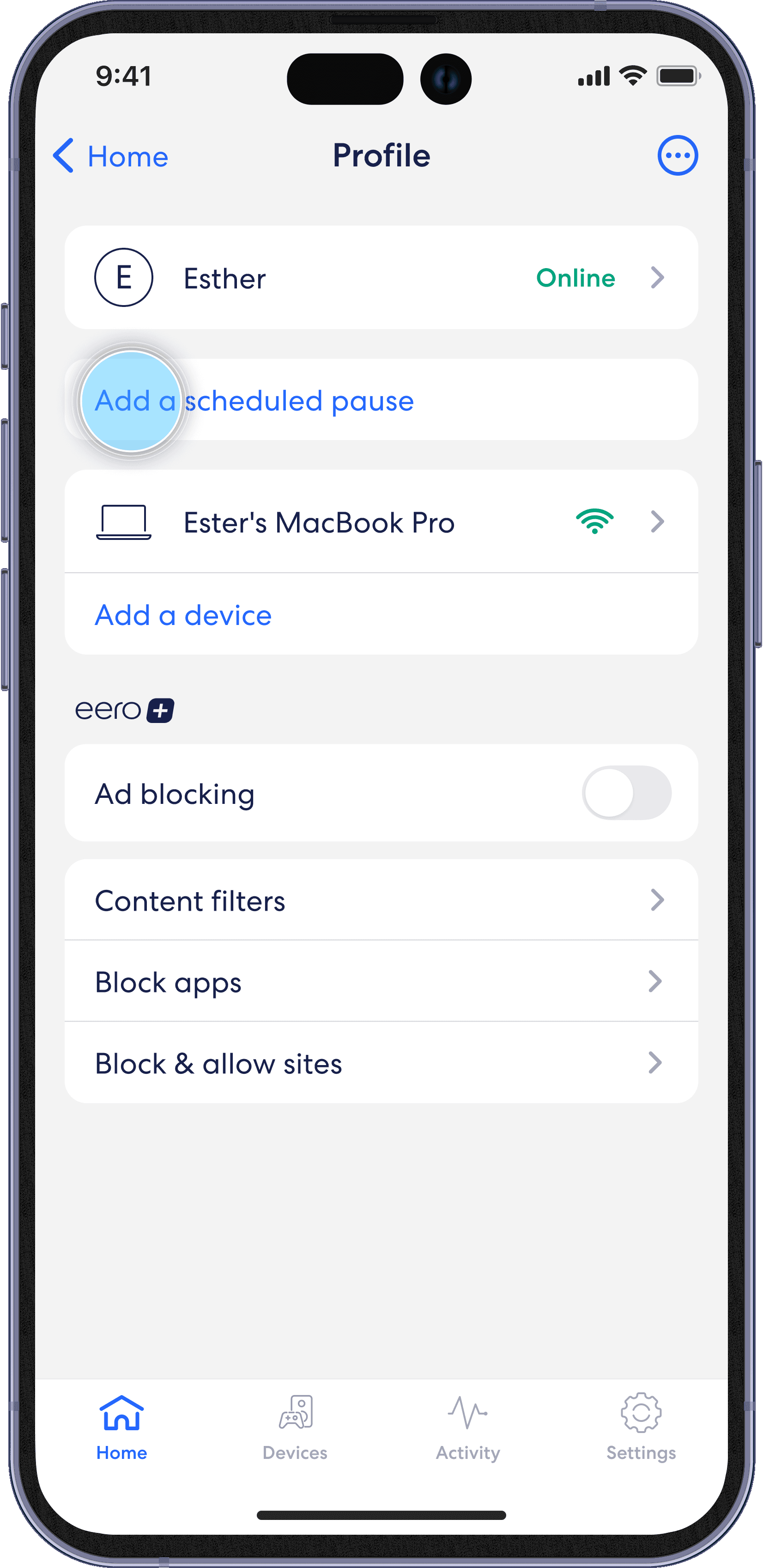 Pause your wifi network by setting schedules for specific profiles or devices.