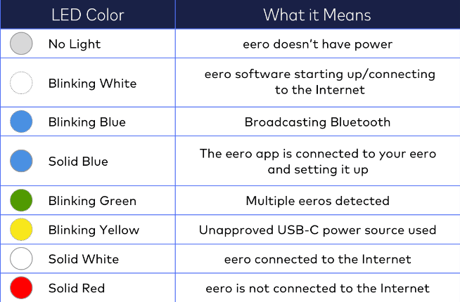 On the front of the eero, there is a LED status light. When everything is running correctly, the eero's